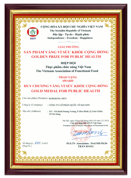 Được sự đánh giá cao của các y bác sĩ, những giáo sư đầu ngành, 3 sản phẩm KoreKing-Men, Não Tâm Vương, TOKO JapanGold đã được trao giải "Sản phẩm vàng vì sức khỏe cộng đồng năm 2016”. Những sản phầm này trong năm vừa qua đã đồng hành cùng hàng triệu người Việt trong công cuộc chăm sóc sức khỏe, sắc đẹp… và nhận được sự tin yêu của khách hàng trên cả nước.