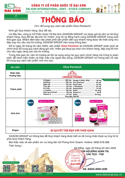 Nhằm gia tăng lựa chọn cho khách hàng, đáp ứng tốt hơn nhu cầu ngày càng cao của thị trường, trong thời gian tới, sản phẩm Eliza Paristech sẽ tồn tại song song hai quy cách chính hãng mà Công ty phân phối, để tránh hiểu nhầm và thắc mắc của người tiêu dùng, DAISON GROUP xin thông báo về việc bổ sung quy cách sản phẩm mới như sau: