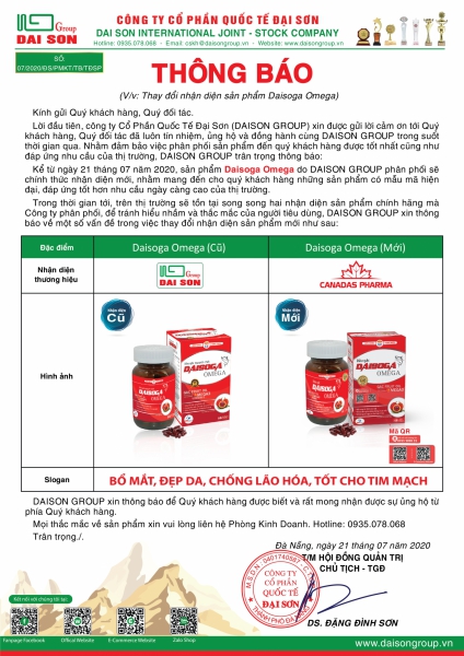 Hiện nay, cùng với việc duy trì nâng cao chất lượng sản phẩm, nhằm phục vụ tốt hơn nhu cầu của người tiêu dùng, Đại Sơn Group đã nghiên cứu và xét thấy cần cải tiến công thức sản phẩm DAISOGA OMEGA để tối ưu hóa chất lượng và định vị thương hiệu sản phẩm, với mục đích mang đến cho Quý khách hàng những sản phẩm “CHẤT LƯỢNG - AN TOÀN - HIỆU QUẢ”, phục vụ tốt hơn cho việc phát triển thương hiệu và xây dựng hình ảnh sản phẩm. Nên Công ty kính thông báo đến Quý khách hàng và người tiêu dùng vê nội dung thay đổi của sản phẩm: