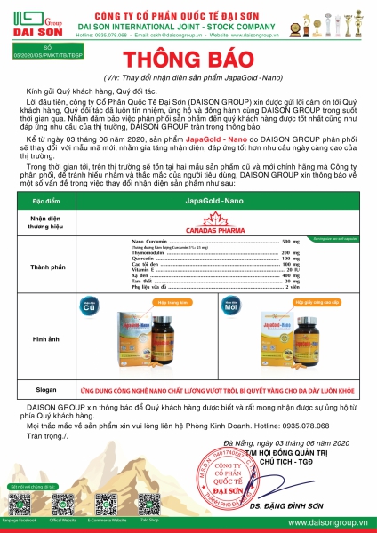 Hiện nay, cùng với việc duy trì nâng cao chất lượng sản phẩm, nhằm phục vụ tốt hơn nhu cầu của người tiêu dùng, Đại Sơn Group đã nghiên cứu và xét thấy cần cải tiến công thức sản phẩm JapaGold Nano để tối ưu hóa chất lượng và định vị thương hiệu sản phẩm, với mục đích mang đến cho Quý khách hàng những sản phẩm “CHẤT LƯỢNG - AN TOÀN - HIỆU QUẢ”, phục vụ tốt hơn cho việc phát triển thương hiệu và xây dựng hình ảnh sản phẩm. Nên Công ty kính thông báo đến Quý khách hàng và người tiêu dùng vê nội dung thay đổi của sản phẩm: