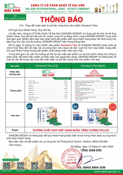 Hiện nay, cùng với việc duy trì nâng cao chất lượng sản phẩm, nhằm phục vụ tốt hơn nhu cầu của người tiêu dùng. Đại Sơn Group đã nghiên cứu và xét thấy cần cải tiến công thức sản phẩm Paristech Flex để tối ưu hóa chất lượng và định vị thương hiệu sản phẩm, với mục đích mang đến cho Quý khách hàng những sản phẩm “CHẤT LƯỢNG - AN TOÀN - HIỆU QUẢ”, phục vụ tốt hơn cho việc phát triển thương hiệu và xây dựng hình ảnh sản phẩm. Nên Công ty kính thông báo đến Quý khách hàng và người tiêu dùng vê nội dung thay đổi của sản phẩm: