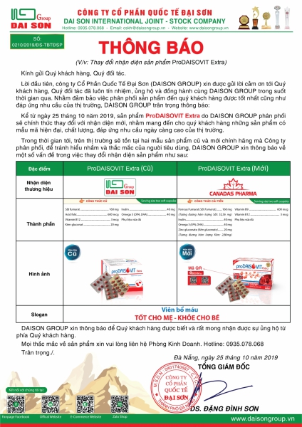 Hiện nay, cùng với việc duy trì nâng cao chất lượng sản phẩm và không ngừng cải tiến mẫu mã bao bì theo phong cách hiện đại, nhằm phục vụ tốt hơn nhu cầu của người tiêu dùng. Đại Sơn Group đã nghiên cứu và lấy ý kiến đông đảo người tiêu dùng, xét thấy cần cải tiến về hình thức sản phẩm PRODAISOVIT EXTRA để tối ưu hóa chất lượng và mẫu mã sản phẩm, với mục đích mang đến cho quý khách hàng những sản phẩm tốt nhất, phục vụ tốt hơn cho việc phát triển thương hiệu, xây dựng hình ảnh sản phẩm PRODAISOVIT EXTRA. Nên Công ty kính thông báo đến Quý khách hàng và người tiêu dùng vê nội dung thay đổi của sản phẩm:
