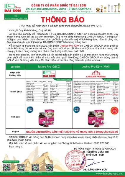 Hiện nay, cùng với việc duy trì nâng cao chất lượng sản phẩm, nhằm phục vụ tốt hơn nhu cầu của người tiêu dùng, Đại Sơn Group đã nghiên cứu và xét thấy cần cải tiến công thức sản phẩm JESKYO PRO - IQ để tối ưu hóa chất lượng và định vị thương hiệu sản phẩm, với mục đích mang đến cho Quý khách hàng những sản phẩm “CHẤT LƯỢNG - AN TOÀN - HIỆU QUẢ”, phục vụ tốt hơn cho việc phát triển thương hiệu và xây dựng hình ảnh sản phẩm. Nên Công ty kính thông báo đến Quý khách hàng và người tiêu dùng vê nội dung thay đổi của sản phẩm: