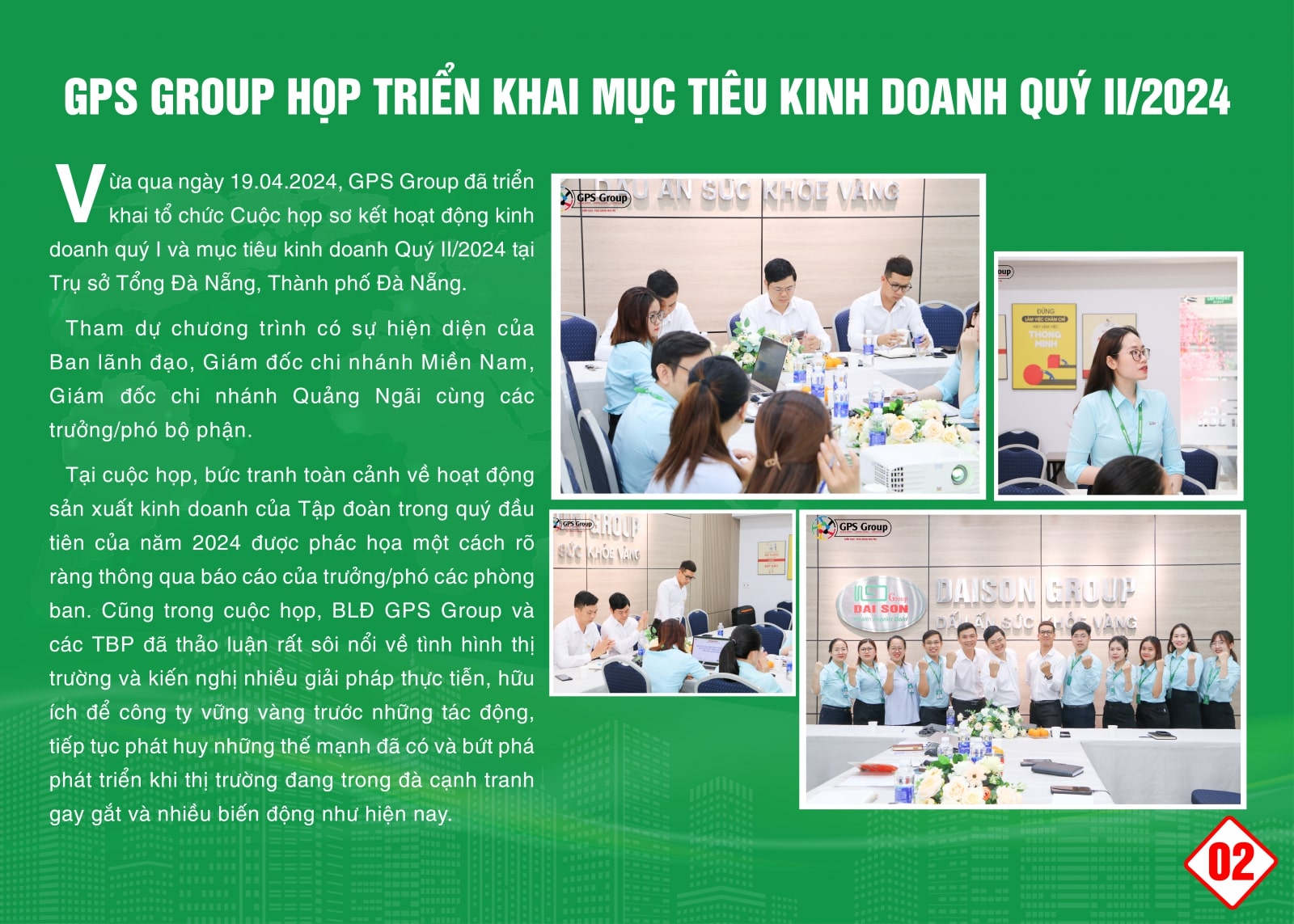 Vượt qua tất cả những thách thức vây quanh. Không khí làm việc tại Tập đoàn vẫn đang diễn ra miệt mài từ văn phòng trụ sở tới khu vực nhằm đảm bảo các mục tiêu đã đề ra. Nửa đầu năm 2024, GPS Group đẩy mạnh hợp tác đầu tư mới, triển khai các dự án cũng như các hoạt động tri ân khách hàng.