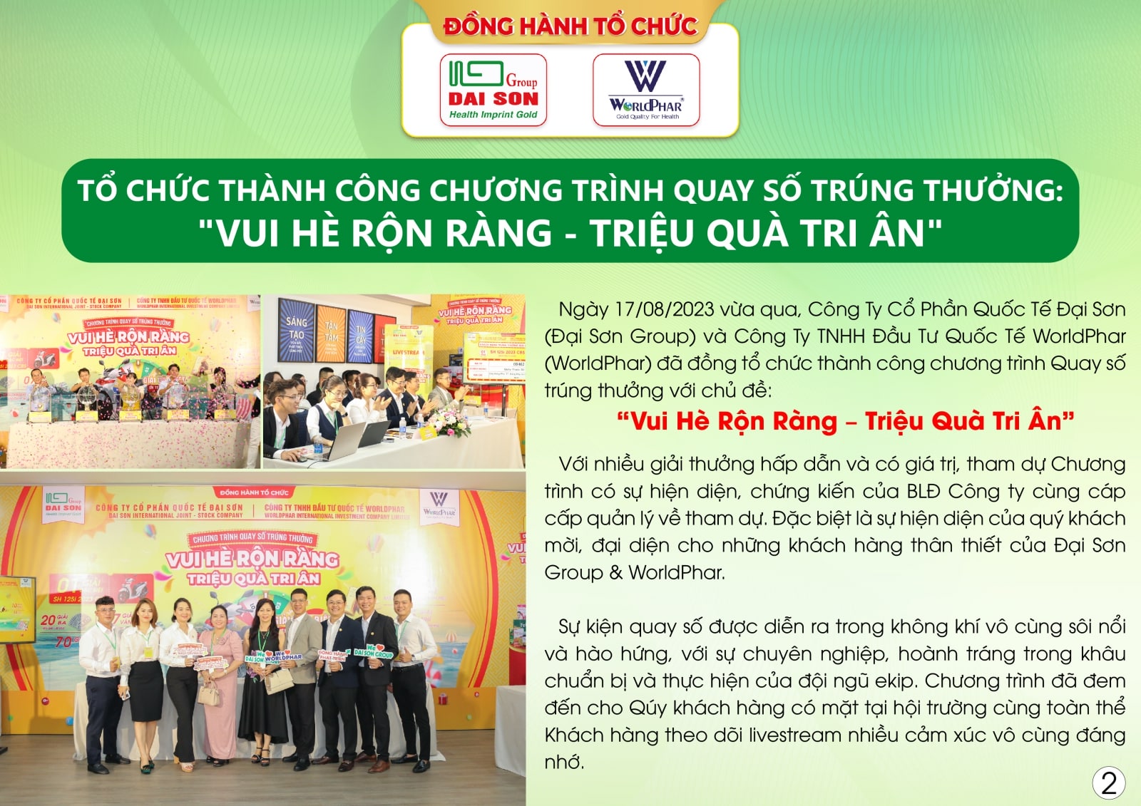 ĐẠI SƠN GROUP VÀ WORLDPHAR TỔ CHỨC THÀNH CÔNG CHƯƠNG TRÌNH LIVESTREAM: “VUI HÈ RỘN RÀNG – TRIỆU QUÀ TRI ÂN”: XẾ SANG ĐÃ CÓ CHỦ