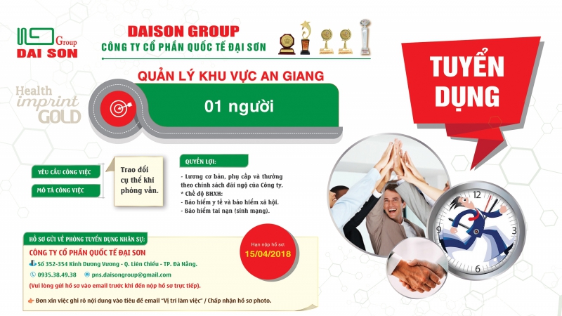 Công Ty Cổ Phần Quốc Tế Đại Sơn (DAISON GROUP), là nhà phân phối chuyên nghiệp về Dược phẩm, thực phẩm chức năng trong nước và nước ngoài. Môi trường làm việc năng động, thân thiện, thu nhập cao. Hiện tại Công ty có hệ thống phân phối bao phủ tất cả các tỉnh - thành phố của Việt Nam với đội ngũ hơn 300 nhân viên. Hiện nay, do nhu cầu phát triển, chúng tôi cần tuyển QUẢN LÝ cho vị trí sau đây: